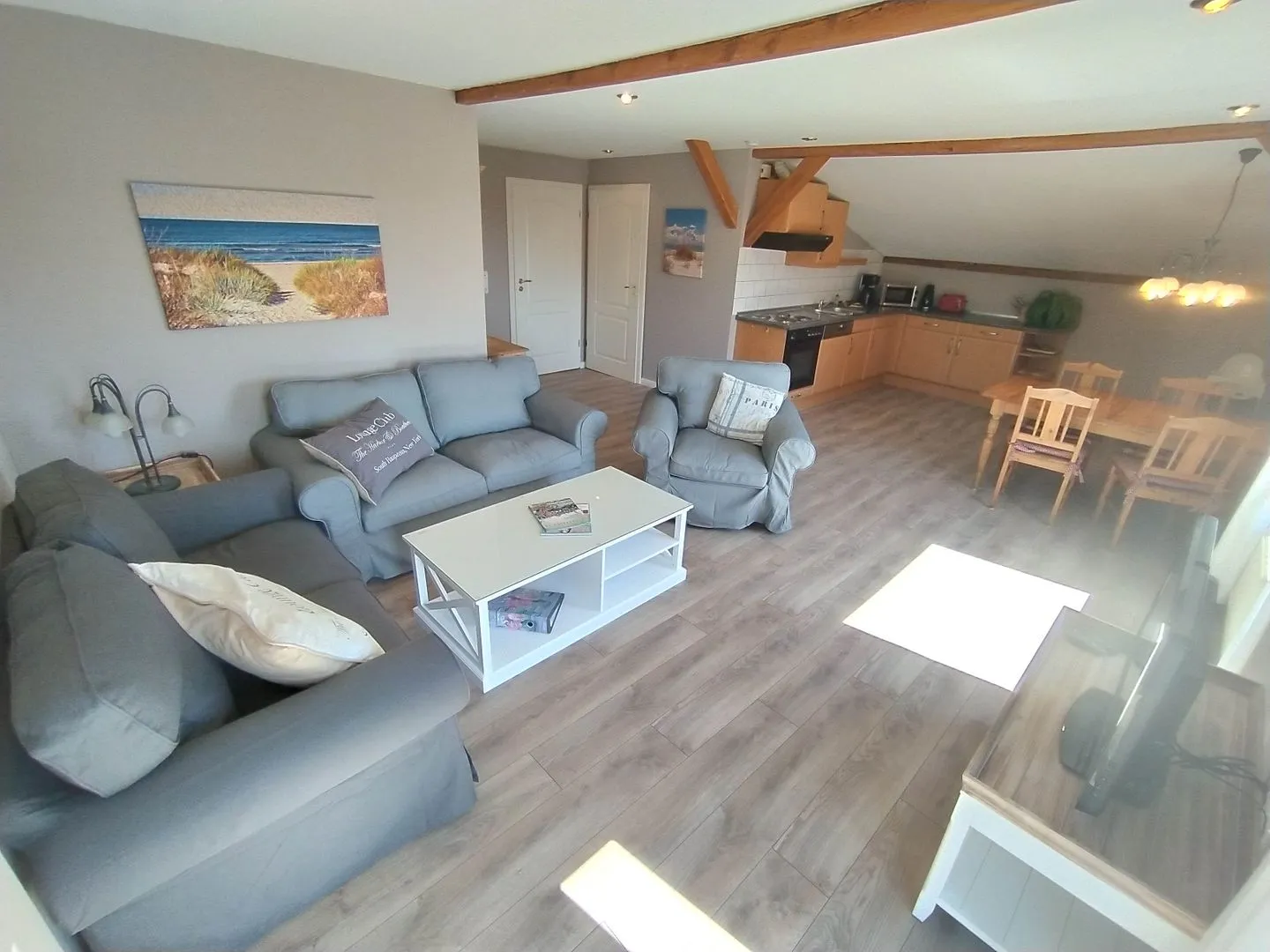Sie erwartet eine liebevolle Ferienwohnung im 1. Stock, mit 80 qm, 2 Schlafzimmern und einem Bad. Sie genießen einen gemütlichen Wohnbereich für entspannte Abende und eine gut ausgestattete Küche. Auf dem Südbalkon entspannen Sie bei einer Tasse Kaffee und lassen den Meerblick und die Weite der Aussicht auf sich wirken. Am Haus steht Ihnen ein kostenloser Parkplatz, im Haus kostenloses w-lan zur Verfügung. Zum Südstrand sind es nur wenige Minuten, egal mit welchem Verkehrsmittel. Die Mitnahme eines Hundes ist willkommen.