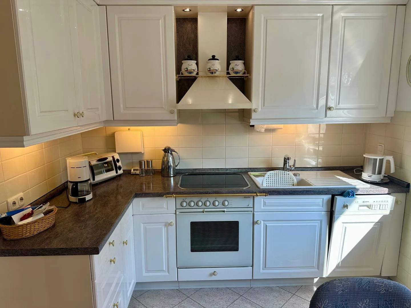 Die geschlossene Küche mit Esstisch ist funktional eingerichtet und verfügt über einen 4-Platten-Herd, Backofen, Mikrowelle, Spülmaschine, Kühlschrank mit integriertem Gefrierfach, Wasserkocher, Toaster, Kaffeemaschine sowie Küchenutensilien, Geschirr und Besteck. Damit haben Sie beste Voraussetzungen, Ihre Mahlzeiten bequem selbst zuzubereiten.