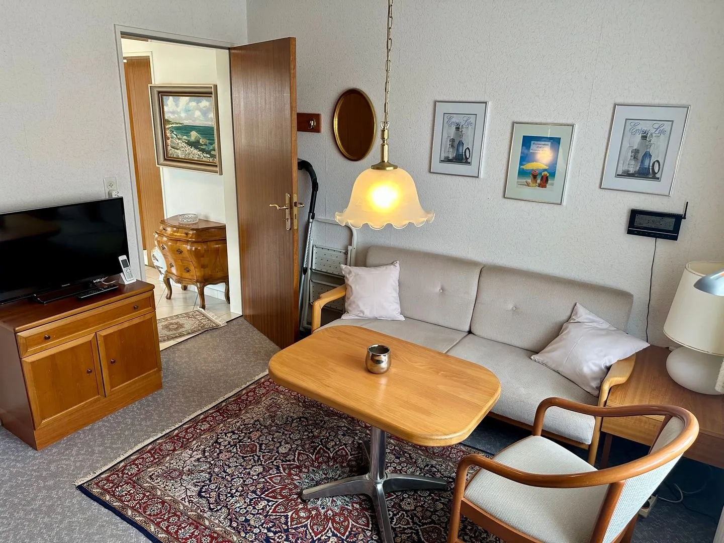 Im Wohnbereich stehen Ihnen eine Sofaecke mit Sofa und Sessel, ein Essbereich sowie 2 TVs mit Kabelanschluss zur Verfügung. WLAN und Internet sind vorhanden. Sichtschutz an allen Fenstern sorgt für zusätzlichen Komfort. Die Unterkunft ist mit Zentralheizung und Fußbodenheizung ausgestattet und damit auch in der kühleren Jahreszeit angenehm nutzbar.