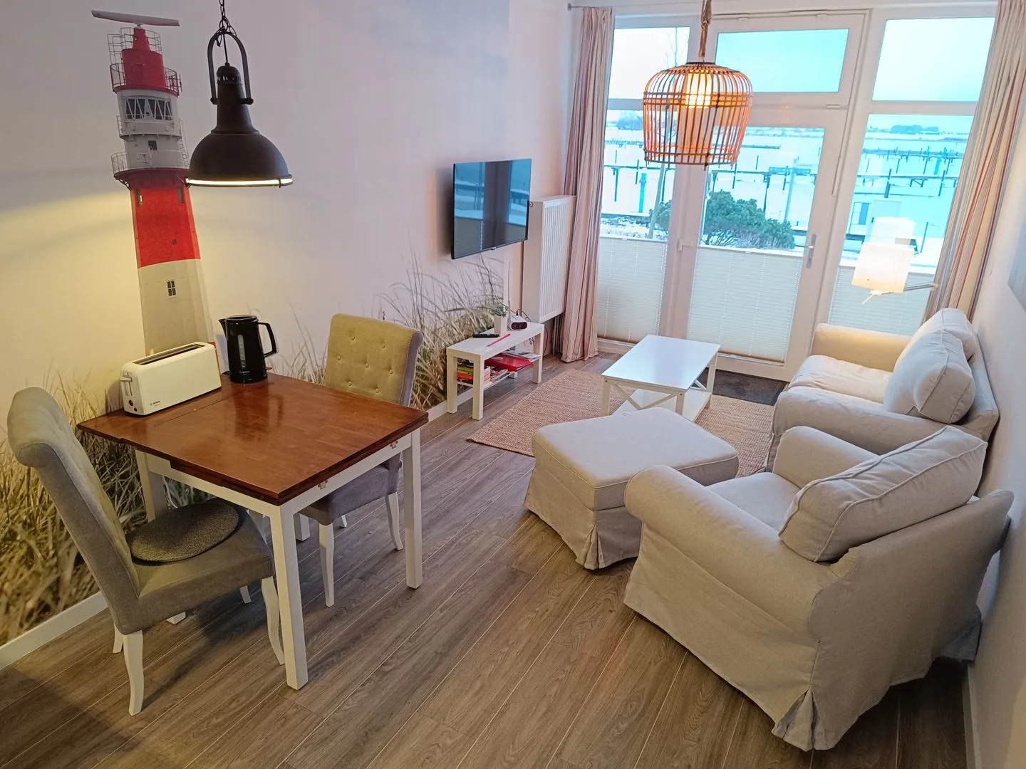 Sie besteht aus einem Wohnzimmer mit Essecke mit 4 Sitzplätzen, einer Versorgungsbar mit Kühlschrank, 2 Platten-Ceran-Feld, Mikrowelle, Kaffeemaschine, Toaster und einem Schlafzimmerbereich mit Doppelbett. Das Besondere ist der einmalige Blick auf die neu gestaltete Hafenpromenade mit eigener, abgetrennter Holzterrasse. Vom Sofa schaut man auf den tollen Leuchtturm an der Zimmerwand und auf die Schiffe im Hafen mit all seinem maritimen Flair. Im Objekt befindet sich ein festes w-lan Netzwerk, in der Wohnung ein smart TV. Das Badezimmer besticht durch seine ebenerdige Dusche und ist somit auch für gehbehinderte Menschen ideal. Der kostenfreie, neugestaltete PKW-Stellplatz ist direkt vor der Tür.