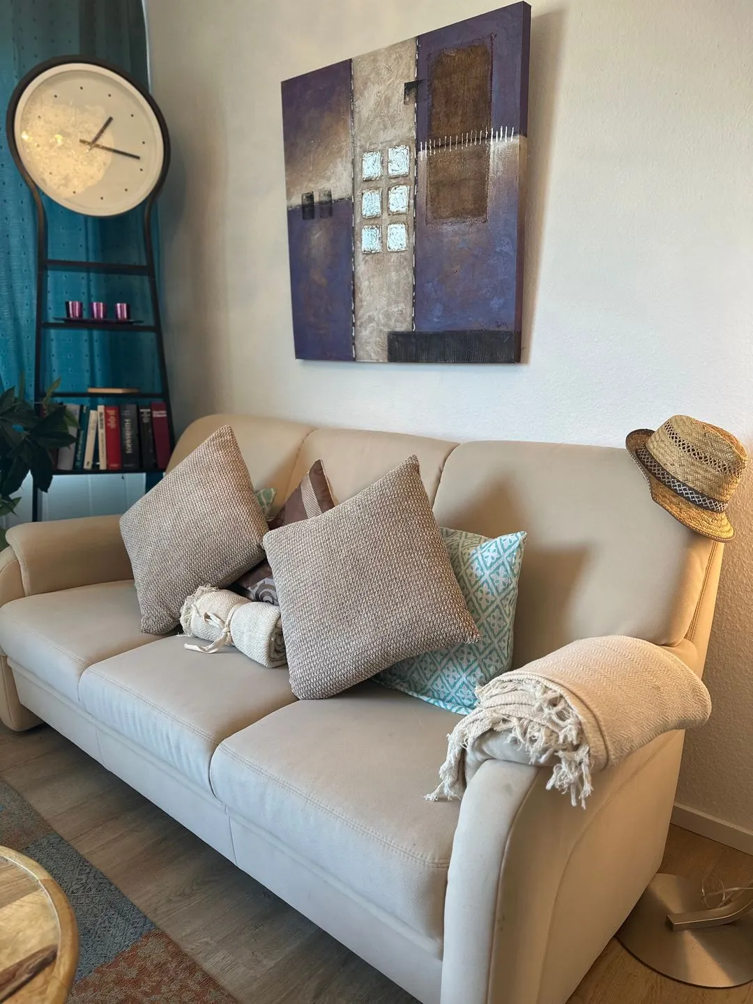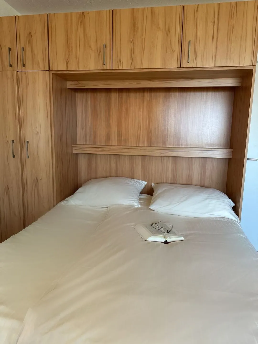 Das Appartement ist für 2 Personen ausgestattet. Der Wohnbereich ist mit einem integriertem Essbereich, einem komfortablen Schrankbett (180*200 cm), sowie einer Fernsehecke und einer großen Fensterfront ausgestattet. Genießen Sie den Ausblick auf den Segelhafen und den Hafen von Burgstaaken.